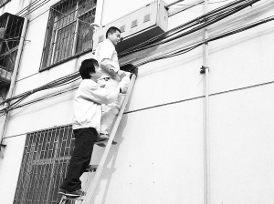 说话时间,华源小区到了,搬上梯子、带着喷水壶,记者随张明忠和贺庆庆来到了出故障的表箱下面,记者跟着也顺梯爬了上去,不大一会儿,燃气表就换好了,贺庆庆边拿出喷壶往刚安装的燃气表的周围喷水,边对记者说,这是在检查是否漏气,里面装的是洗洁精水。从梯子上下来后,贺庆庆还不忘告诉报修用户,“放心吧,现在已经没有任何问题,可以放心使用了”。贺庆庆说,这个小区的装表位置还比较容易搭梯,遇到地形复杂的,维修起来十分麻烦。