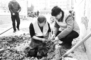 胡同口就是风口,由北向南的穿堂风异常阴冷。随着一平方米左右的维修坑越挖越深,积水逐渐升到了腿弯处,大约挖了60厘米,地下的管道漏了出来,果然管道接口处有两处裂缝一直在不停地向外冒水,随着继续深挖,管子完全露了出来,而此时,维修坑里的水已经到了大腿处。