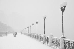 2月22日,行人走在雾雪笼罩的吉林省吉林市松花江畔。 当日凌晨,吉林省吉林市降下春季以来首场大雪,并伴随4级大风,最低温度达零下14摄氏度。(新华社发)