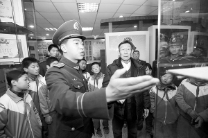 2月24日,武警某部一连学雷锋展览馆的一名讲解员为前来参观的“雷锋”们介绍这个连队的学雷锋事迹。驻甘肃平凉市的武警某部一连是武警部队的学雷锋先进连队,当日,来自甘肃一些企业和学校的“老雷锋”、“小雷锋”来到这个连队参观交流,弘扬雷锋精神。