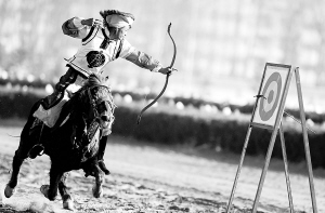 2月24日,骑手在表演骑马射箭。当日是藏历水龙新年大年初三,西藏自治区马术队举办藏族传统马术表演欢庆新年,来自拉萨各族各界群众近万人观看了精彩的马术表演。(新华社发)