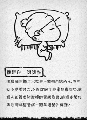 这种睡姿显示出你是一个有自信的人。枕着他们习惯的臂膀侧睡——这种姿势代表他们将会变成一个有权势的有钱人。(陈德)
