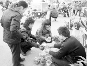 市民在精心挑选自己喜欢的花卉。春天来了,搬几盆花回家感受浓浓春意成了许多市民的选择。近日随着气温逐步回升,不少市民大盆小盆地把花抱回家,感受着春天清新的味道。