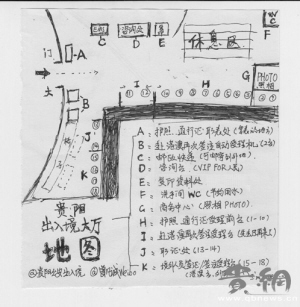 这张地图上,作者将出入境大厅按字母A到H排序,依照功能划分了11个区,地图右下角将各个区的功能进行了注释,在一些特别的功能区,还做了细心的标注。比如商务中心这个区域,作者在旁边的功能注释写上了“照相PHOTO”。洗手间除了用英文简写标注外,还提示要“节约用水”。作者还在备注中提示办证人员,在前往赴港澳自助签证受理台办理业务前,应该先到I区,即赴港澳再次签注自动受理机。