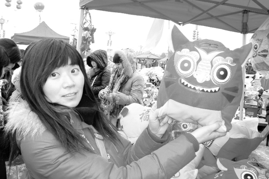 在淮阳县民俗庙会上,一位女孩在挑选“布老虎”。每年农历的二月初二至三月初三是当地传统的庙会节日,平时难得一见的布老虎、泥泥狗、吹面人、捏糖人等手工艺品为庙会增添了特有的风情。刘飞 摄