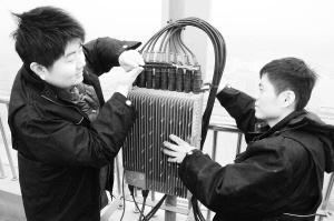 刚站上楼顶,记者就感受到了风的威力,感觉冷空气顺着领子、袖口往身子里灌。维修人员分为2组,一组到报社基站主机房内寻找故障区域,一组在楼顶用仪器开始逐段检查。“这个天线发射信号不强。”通过检查,维修人员指着楼顶边上一个伸出楼顶外约50厘米的“铁板”说。