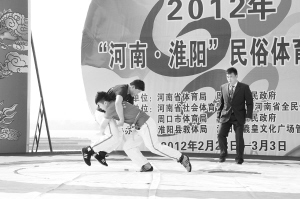 2月28日,为期5天的“河南·淮阳”民俗体育赛在淮阳龙湖畔开幕,来自全省各地的200余名运动员参加了比赛。本次比赛旨在弘扬传统体育文化精神,推动全省民俗体育项目的发展,项目设置有中国式摔跤和空竹竞技赛。(记者 侯俊豫 摄)