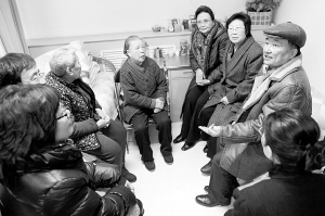 政协委员调研老龄化问题 3月1日,社区老人田淑明(左四)等和前来调研的全国政协委员交流。当日,全国政协委员伊丽苏娅(右四)、杨佳、尉中民、严慧英、李国安(右二)、华以刚来到天下椿萱老年看护服务公司有色社区服务中心,对社会化养老等问题进行调研。