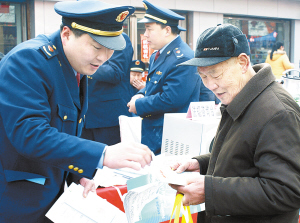 扶沟县工商局工作人员正在向消费者发放维权宣传手册。在第49个“学雷锋活动日”来临之际,该局组织工商人员开展“学雷锋”普法宣传服务活动,为群众提供工商法律法规咨询、创业咨询及消费维权等方面的服务。(卢付昌 摄)