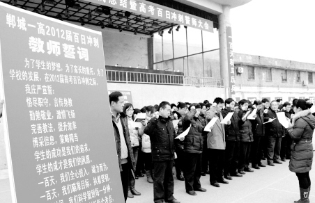 图为郸城一高高三教师在进行“百日冲刺”集体宣誓。近日,郸城一高隆重召开“百日冲刺”誓师大会,全体高三师生纷纷定目标、表决心、发誓言,进入到高考备考冲刺状态。(王雪涛 摄)