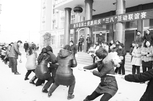 图为西华县国土局的女职工正在参加拔河比赛。