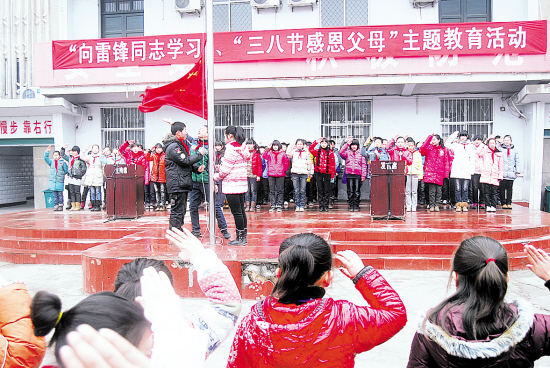 3月5日,周口市六一路小学在升旗式上对全体师生进行“向雷锋同志学习”、“三八”节感恩父母主题教育活动。集会上,学生代表给大家发出倡议,号召全体学生向雷锋同志学习,从小事做起,从自身做起,并倡议全体学生在“三八”妇女节里给父母做一件有意义的事。 (王晓慧 王敏 摄)