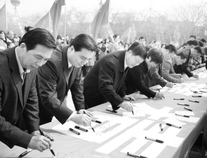 3月14日,由项城市委宣传部、项城市文明办主办的“弘扬雷锋精神,开展志愿服务”万人签名活动举行。周口市委宣传部副部长张治光等周口市有关部门负责人和项城市市长黄真伟等四大班子领导参加签名活动。记者 杨光林 摄