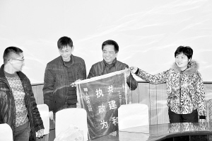 昨日,位于市区工农路的市盐业局家属院的住户自发来到市盐业局,送来一面写有“执政为民,共建和谐”的锦旗。多年来,在小区建设发展方面,该局一直为创建和谐文明的社区而努力,在小区环境绿化、消除安全隐患以及提高社区文明等方面注入大量心血,受到居民群众的热烈欢迎。(记者 王映 摄)