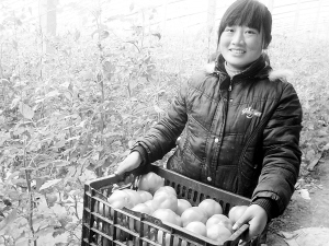 商水县东城街道办事处苏庄村苏丽在采收番茄。在幸福家庭行动中,苏丽得到了项目工程的资金帮扶,建起了一座1.5亩的日光温室,种植反季节蔬菜,两年多来,每年靠日光温室收入4万多元。