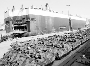 “秃鹫”韩美联合军演继续进行 这是3月20日在韩国釜山港拍摄的参加军演的装甲车辆。当日,“秃鹫”韩美联合军演继续进行。代号为“秃鹫”的联合野外机动演习于3月1日至4月30日举行。新华社发