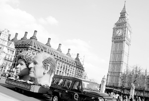 ▲绿植饰白丝 3月21日,在英国伦敦,巨大的英国女王伊丽莎白二世和丈夫菲利普亲王的头像雕塑被拖车拉着从大本钟前经过。当日,巨大的英国女王伊丽莎白二世和丈夫菲利普亲王的头像雕塑在伦敦街头巡游展示,以庆祝女王伊丽莎白二世登基60周年。这对女王夫妇头像雕塑的“头发”由各种鲜花和绿色植物构成,吸引了许多游客驻足观看。