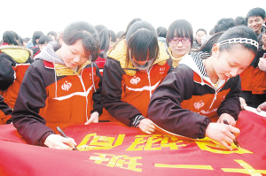 3月18日,鹿邑县三高举行2012年中考百日誓师大会。会后,初三全体师生纷纷在誓师百米长卷上签名,坚定成功信念。(冯伟 摄)