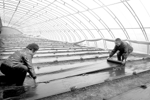 昨日,沈丘县一对农民夫妇正在大棚内铺设薄膜,准备种植西红柿。随着天气转暖,农民开始投入春耕生产。(记者 王映 摄)