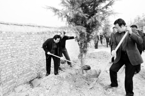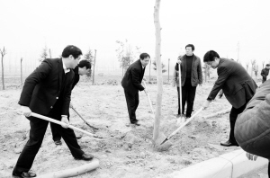 一到植树点,县四大班子领导就兴致勃勃地拿起铁锨,同县林业局的同志一起种树。为了保持行列整齐划一,县领导一边挥锨填土,一边扶树调整,提水浇灌,处处是忙碌的身影,两个小时就种植了500多株。放眼望去,河堤两侧彩旗飘扬,宣传标语大气磅礴,一行行排列整齐的法桐、大叶女贞、木槿、百日红、金丝柳等在寒风中,一棵棵昂然挺立,给生机盎然的春天又增添了几分绿意。