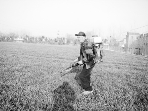 为控制麦田杂草和病虫害发生,连日来,项城市李寨镇镇村人口学校聘请农技人员开设技术讲座,动员农民深入到田间为小麦打药除草,防治小麦病虫害的发生。图为该镇后韩村农民韩双全在麦地里打药除草。