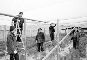 鹿邑县太清宫镇陈楼村青年农民闫建党在村委会和财税所帮助下,投资10多万元建起了万只山鸡养殖场,填补了当地养殖业的空白,也谋得了市场先机。图为闫建党正在架设顶网和鸡舍。