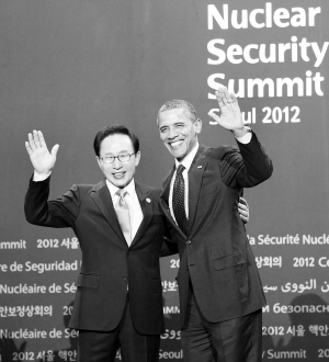 首尔核安全峰会开幕 3月26日晚,韩国总统李明博(左)和美国总统奥巴马在首尔的迎宾仪式上向记者挥手致意。当日,第二届核安全峰会在首尔开幕。 新华社记者 庞兴雷 摄