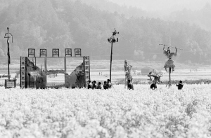 浙江仙居:油菜花地里的迎春民俗庙会 仙居县双庙乡的大片油菜花盛开,稻草人竖立在其中(3月27日摄)。3月27日,浙江省仙居县双庙乡以“田园本色”为主题在大片盛开的油菜花地里举行特色乡土民俗庙会。每逢农历三月,春回大地,仙居县当地群众举行盛大的民俗庙会,用舞龙、抬阁、龙狮等特色民俗表演迎接春季,祈求在新一季农耕开始时能风调雨顺、五谷丰登。