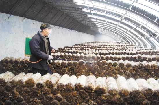 昨日上午,一农民在为蘑菇喷水。近年来,我市各级政府把温室大棚内种植蘑菇、豆角等作为农民增收的重点项目推广,引导、鼓励大棚种植户走“合作社+基地+农户”的新路子,使一大批农户靠种植大棚蔬菜走上了小康路。(记者 王映 摄)