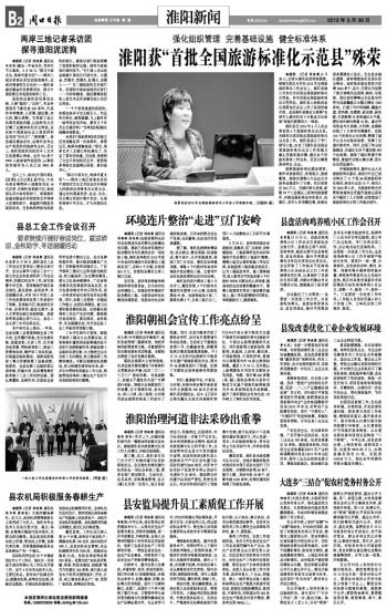 本报讯 (记者 侯俊豫)3月28日,记者从淮阳县宣传部获悉,刚刚在武汉召开的2012年全国旅游标准化工作会议上,淮阳县被正式命名为首批全国旅游标准化示范县。作为首批全国旅游标准化示范单位,淮阳县人民政府县长胡景旭在会议上作了典型经验介绍。这是淮阳县继近日获得“全球华人最向往的十大根亲文化圣地”荣誉后获得的又一殊荣。