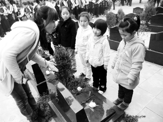 在清明节即将来临之际,我市各界群众、学生来到周口革命烈士纪念馆凭吊先烈。图为市实验幼儿园的孩子们在老师的带领下给烈士墓敬献白花。(记者 王映 摄)