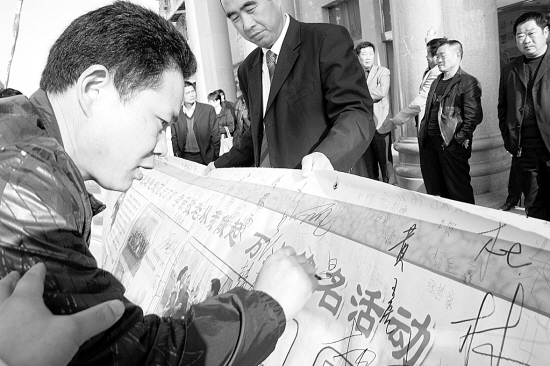 4月1日上午,西华县退休干部、县老年协会会长史永德在县人民会堂门前组织了“孝亲敬老从我做起万人签名”活动。图为群众正在签名。 记者 张猛 通讯员 刘豫东 摄