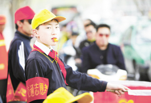 4月14日,洛阳小学生志愿者和老师一起在路口维持交通秩序。自第30届中国洛阳牡丹文化节开始以来,河南省洛阳市各志愿者团体纷纷行动,义务服务,助力盛会。(新华社发)