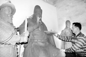 郸城县石槽乡翟庄行政村时庄自然村村民张城镇自幼爱好绘画、雕刻艺术,刻苦自学成才,熟练掌握了各类塑像的制作、彩绘技术。2003年张城镇设计创作的毛泽东标准站像得到了延安、韶山及北京相关单位的一致认可,在全国公开制作发行。近20年来,他先后在周口各县市、驻马店市及山东济南等地完成毛泽东站像、关公坐像等塑像作品上千件,人物栩栩如生,刻画细致入微,充分展示了中国雕塑艺术的魅力,被誉为“豫东大型雕塑第一人”。图为张城镇应邀在西华县洪山庙古文化遗迹处塑关公组像。