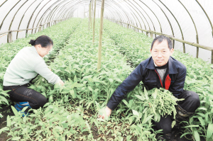 4月17日,江西省永丰县佐龙乡的邓勇生(右)在绿色菜园里采摘空心菜。近年来,江西省永丰县大力推进创新、创绿、创品牌“三创工程”。如今,该县蔬菜种植面积23万亩,总产量达41万吨,产值5.2亿元,绿色蔬菜和蔬菜加工产品畅销海内外。(新华社发)