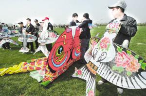 4月17日,参赛者在山东省潍坊市浮烟山国际风筝放飞场准备进行比赛。当日,“2012年山东潍坊风筝大赛”在潍坊市浮烟山国际风筝放飞场举行,来自潍坊市的95支风筝放飞队参赛,共有1156只风筝参加角逐。各式各样的风筝迎风飞舞,令人眼花缭乱。(新华社发)
