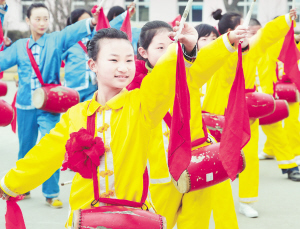 秦皇岛小高庄村小学的学生在少年宫练习腰鼓(4月16日摄)。河北省秦皇岛市为进一步扩大乡村少年宫覆盖面,丰富广大农村少年儿童的课余生活,依托现有的农村学校,采取新建或改扩建的形式集中建设乡村学校少年宫,取得了良好效果。(新华社发)