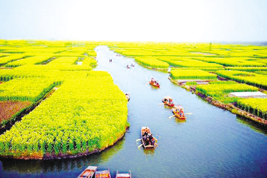 4月,游客在江苏省兴化市千岛菜花景区乘船观赏盛开的油菜花。眼下正是江苏省兴化市千岛菜花景区油菜花盛花期。金灿灿的油菜花在水道围成的垛田上形成一片片金黄色的“花海”,美不胜收,引得国内外游客纷至沓来徜徉花海。新华社发