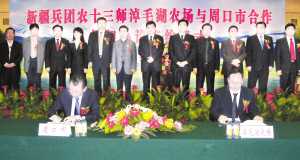 本报讯 (记者 李莉 )4月17日至19日,以新疆兵团农十三师党委常委、人武部长段斌为团长的新疆兵团农十三师淖毛湖农场党政代表团来我市考察。18日上午,我市与新疆兵团农十三师淖毛湖农场在周口饭店签订合作框架协议。省水利厅副厅长,农十三师党委常委、副师长王新伟,市委书记徐光,市委副书记、代市长岳文海,市人大常委会主任李洪民,市政协主席穆仁先,市委常委、常务副市长刘继标,市委常委、市委秘书长史根治,市人大常委会党组成员、市政府秘书长游保峰等出席签约仪式。