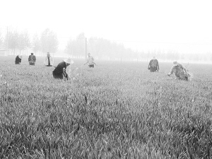 项城市李寨镇组织干部群众加强小麦中后期病虫害防治、追肥、浇水、除草等科学管理,确保今年小麦取得好收成。图为该镇帮扶小分队在为麦田人工除草。