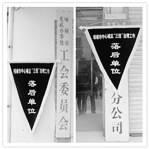 孙鸿俊为光武办事处、项城市电信局两家落后单位授予了黑旗(如下图)。落后单位负责人表示,在下一步工作中,决心进一步加强领导,统一思想和认识,加大工作力度,加强队伍建设,采取得力措施,全力以赴做好中心城区“三违”整治工作,确保进入先进位次,向项城市委、市政府和项城人民交上一份满意的答卷。