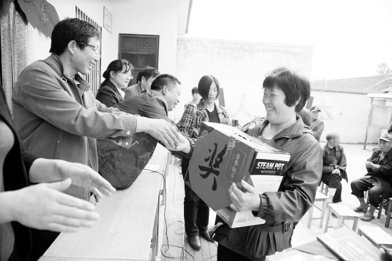 扶沟县大李庄乡大李庄村村民王倩接过奖品和证书,高兴得合不拢嘴。为进一步弘扬传统美德,倡导文明和谐的社会风尚,扶沟县大李庄乡在大李庄村举行首届“孝子孝媳”表彰大会。该村5名“好媳妇”受到表彰。(记者 王泉林 通讯员 李杰 张红霞 摄)
