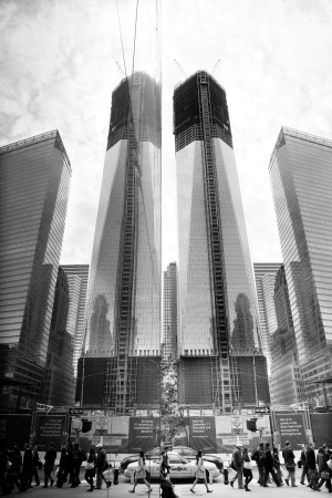 在建纽约世贸中心1号楼成为纽约第一高楼 4月30日,人们从正在建设的纽约世贸中心1号楼(中右)下经过,旁边高楼的玻璃幕墙反映出世贸中心1号楼的影像(中左)。当天,纽约世贸中心1号楼已建设到第100层,高度达到1271英尺(约合387.4米),超过了帝国大厦在安装天线前的381米,成为纽约第一高楼。纽约世贸中心1号楼设计高度为1776英尺(约合541米),预计将于2013年竣工。新华社发