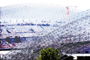 周口体育场东西两侧的框架钢结构日前成功合龙。如今,雄伟壮观的体育场轮廓初现。市体育场建成后,能够承办国际、国内足球、田径等体育赛事,也将成为我市大型文体表演的理想场所。(记者 沈湛 摄)