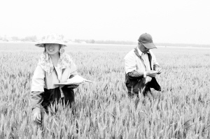 黄泛区农场地神农科所品展中心拥有300亩高标准试验田,每年参展小麦品种200多个,是豫东地区最大的小麦品展中心。图为科研人员在察看小麦穗粒数,分析不同品种的特性,确保今年夏粮丰产丰收。(钱国顺 宁志广 摄)