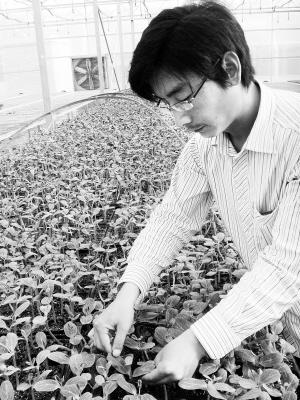 扶沟县豫星农业科技有限公司采取无土栽培进行蔬菜育苗,年育苗3000万棵,引领扶沟县菜农更新品种,改善蔬菜品质,提高蔬菜的种植效益。图为该公司技术人员在育苗温室内察看西瓜苗的长势。