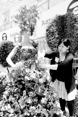鲜花时装艺术展在港举行 5月8日,花艺师谢莉·黄在展示会上现场制作鲜花时装。当日,来自美国的花艺师谢莉·黄在香港展示以多种鲜花为材料的鲜花时装艺术品,包括长裙、晚装、帽子、高跟鞋和手袋等。