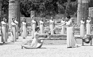 奥林匹克圣火通常于奥运会开幕前几个月在奥运会的发源地——希腊奥林匹亚的赫拉神庙前点燃,其取火方式遵循古希腊的传统,由最高女祭司在神庙前朗诵致太阳神的颂词,然后利用凹面镜聚集阳光,产生高温引燃圣火,这是采集奥林匹克圣火的唯一方式。圣火点燃后,火种被置于一个古老的火盆中,由最高女祭司带到古奥林匹克竞技场,点燃第一名火炬手手中的火炬,随后开始它前往奥运会举办城市的行程。