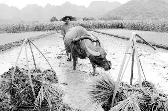 连日来,广西百色市平果县几场大雨使干裂的田地重获生机,新圩村农民抓住时机抢种早稻,田野里一派繁忙景象。图为新圩村一名村民在耙田。 新华社发