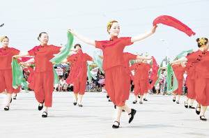 日前,扶沟县吉鸿昌广场乐曲飞扬,欢声雷动,由该县教体局主办的“我健康、我快乐”全民健身舞展演在这里举行。来自全县20余个团体表演了舞蹈、抖空竹、扇子舞、街舞等。(纪俊辉 摄)